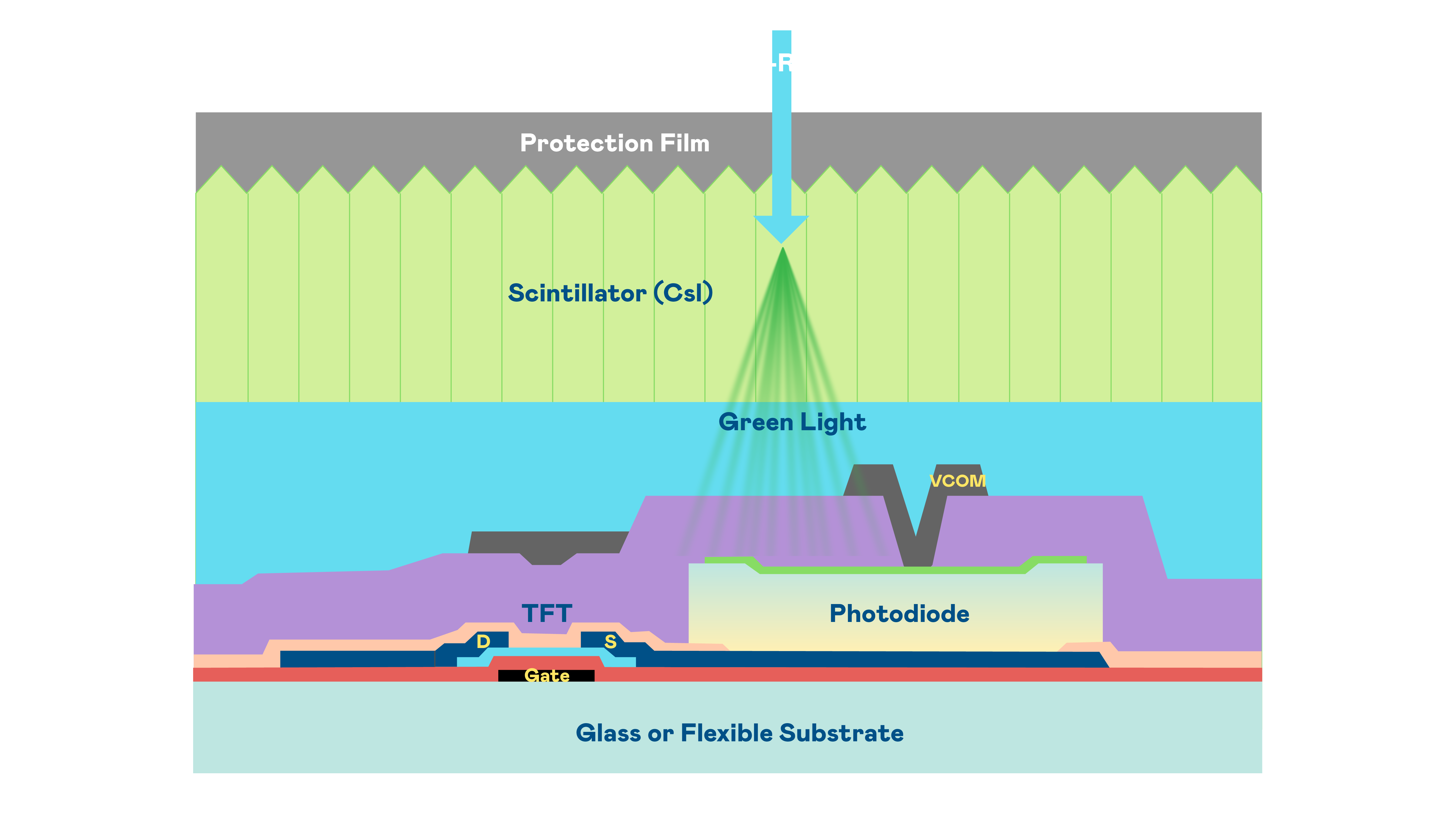 1xBET的X光影像感测阵列使用薄膜电晶体 (TFT) 作为每个像素的读取开关,搭配光电二极体(Photodiode)的光电转换元件,用以感测X光影像讯号。